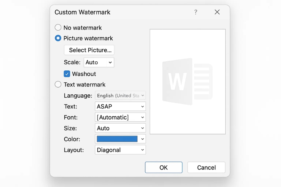 Trong menu Watermark, bạn chọn Custom Watermark… (hoặc “Printed Watermark” tuỳ bản cài đặt). Một hộp thoại bật lên, thường có hai lựa chọn: