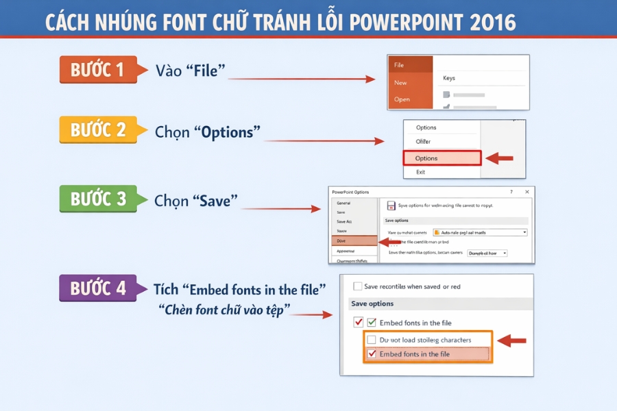 Giải pháp “đúng bài” nhất là: nhúng font vào file PowerPoint (Embed fonts). Làm xong, file mang theo font, mở trên máy khác ít bị đổi chữ hơn hẳn. Đỡ đau đầu!