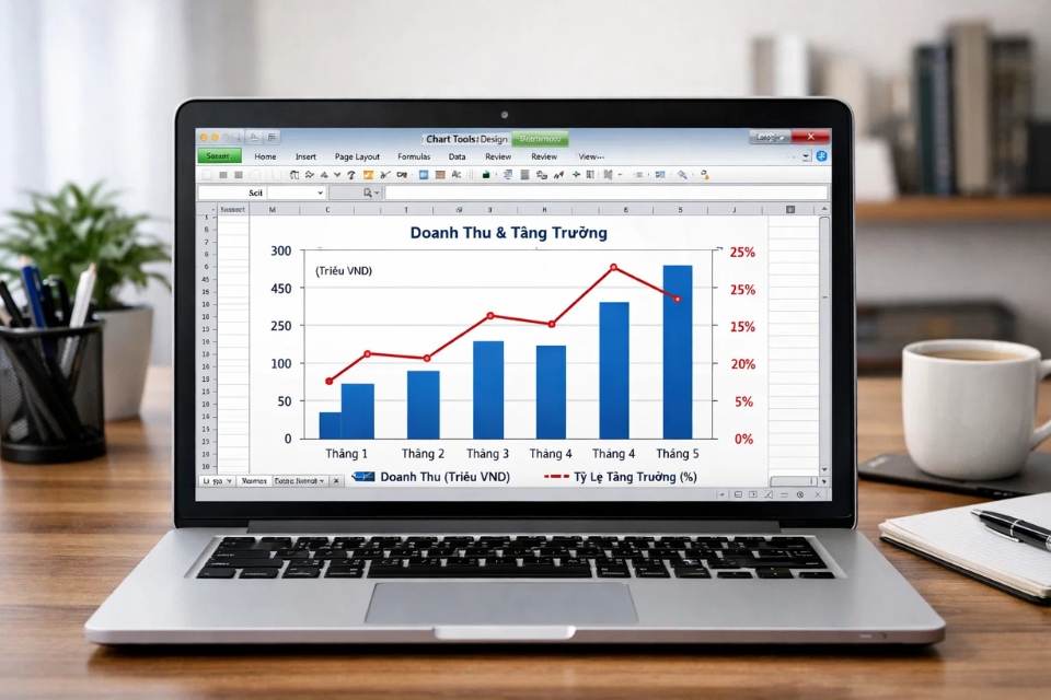 Bạn có thể chỉnh lại tiêu đề biểu đồ, tên trục tung – trục hoành, đổi màu cột, đổi kiểu đường. Tất cả đều nằm trong Chart Tools, xuất hiện khi bạn bấm chọn vào biểu đồ. Cứ thử nghịch vài lần, bạn sẽ quen rất nhanh.