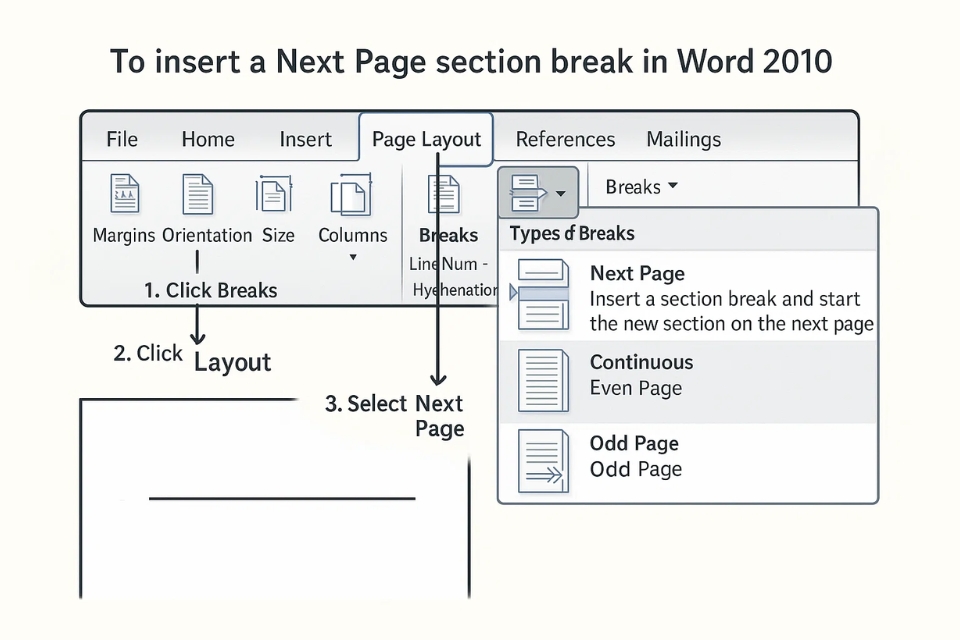 “A clean flowchart visualizing the full process of setting different page numbers for each section in Word 2010, soft pastel colors.”