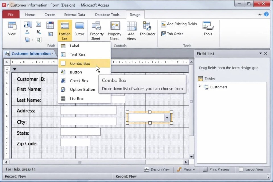 1. Trong Design View, chọn Combo Box