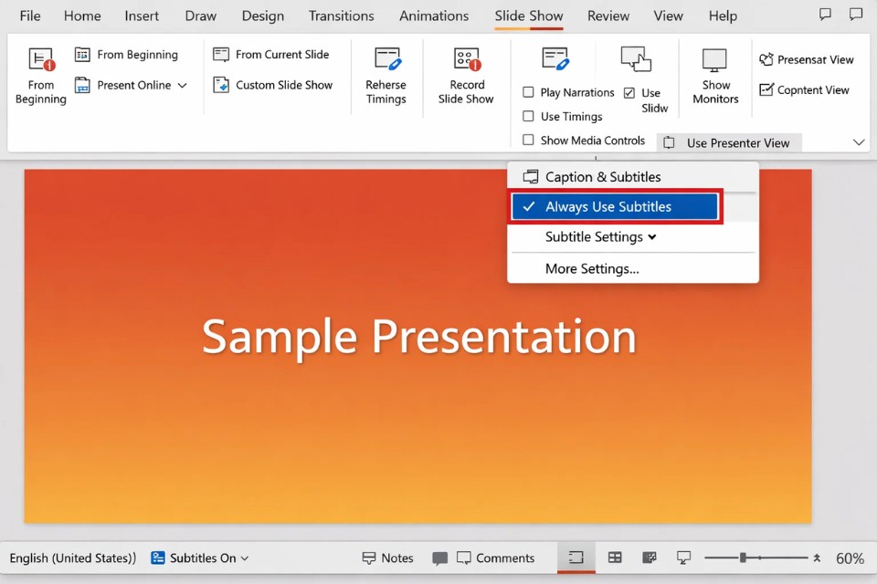 Subtitle vẫn hiển thị trên slide, và người xem online vẫn thấy được. Rất hữu ích cho lớp học online hoặc họp từ xa.