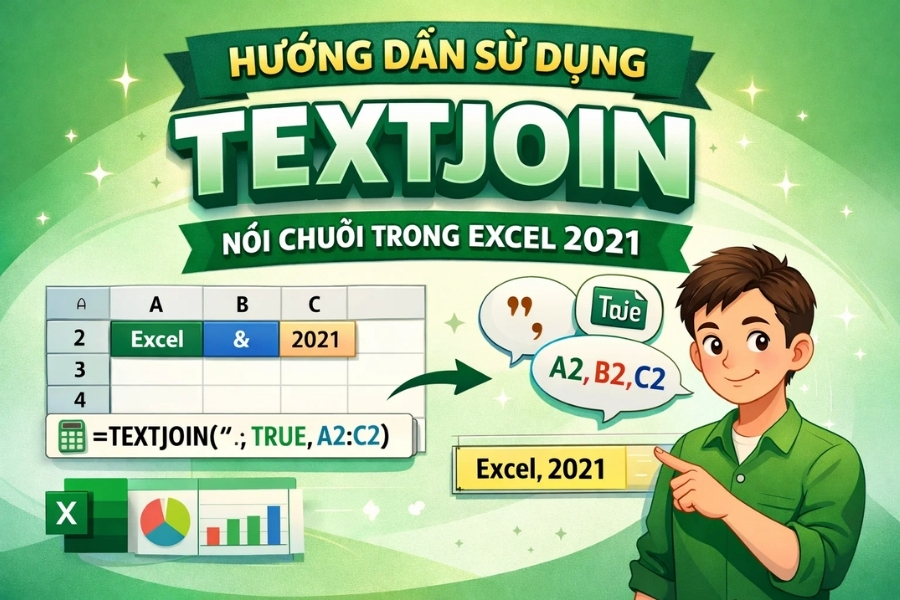 Trong bài viết này, mình sẽ hướng dẫn bạn cách sử dụng hàm TEXTJOIN để nối chuỗi trong Excel 2021 một cách dễ hiểu nhất. Không lý thuyết khô khan, không công thức rối rắm. Chúng ta cứ vừa học vừa nói chuyện, như hai người đang ngồi cạnh nhau trước màn hình Excel vậy.