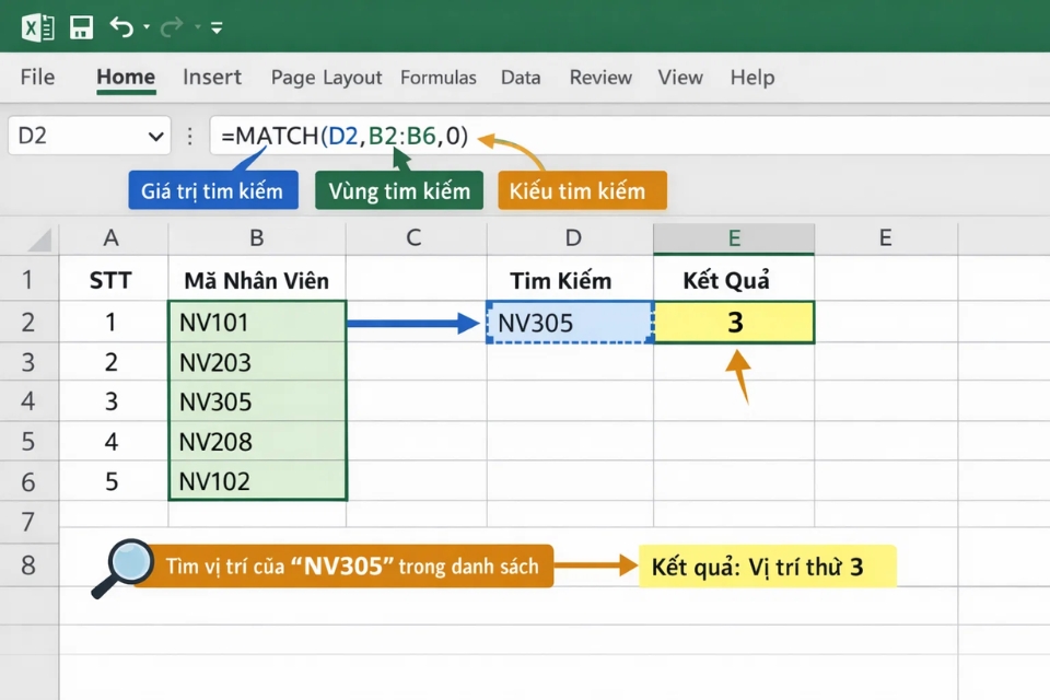 Nếu NV05 nằm ở dòng thứ 6 trong vùng A2:A20, MATCH sẽ trả về số 6. Nhiều người mới hay nhầm chỗ này, nên nhớ kỹ: MATCH chỉ trả vị trí, không trả dữ liệu.