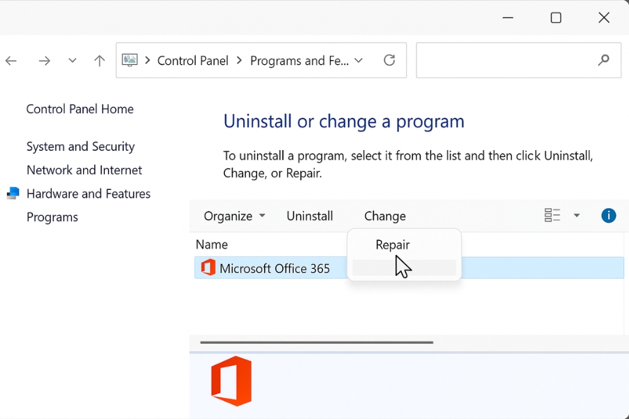 Nếu bạn thấy 1–2 triệu chứng trên, giải pháp đơn giản nhất là Repair Office bằng Control Panel.