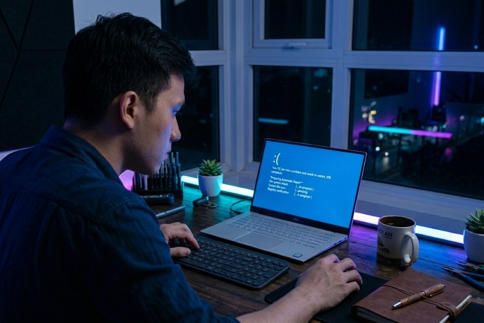 Nhưng rồi… nó cứ đứng đó. Hoặc tệ hơn, nó restart và quay lại đúng màn hình đó. Lặp đi lặp lại. Không vào được desktop. Không làm được gì.